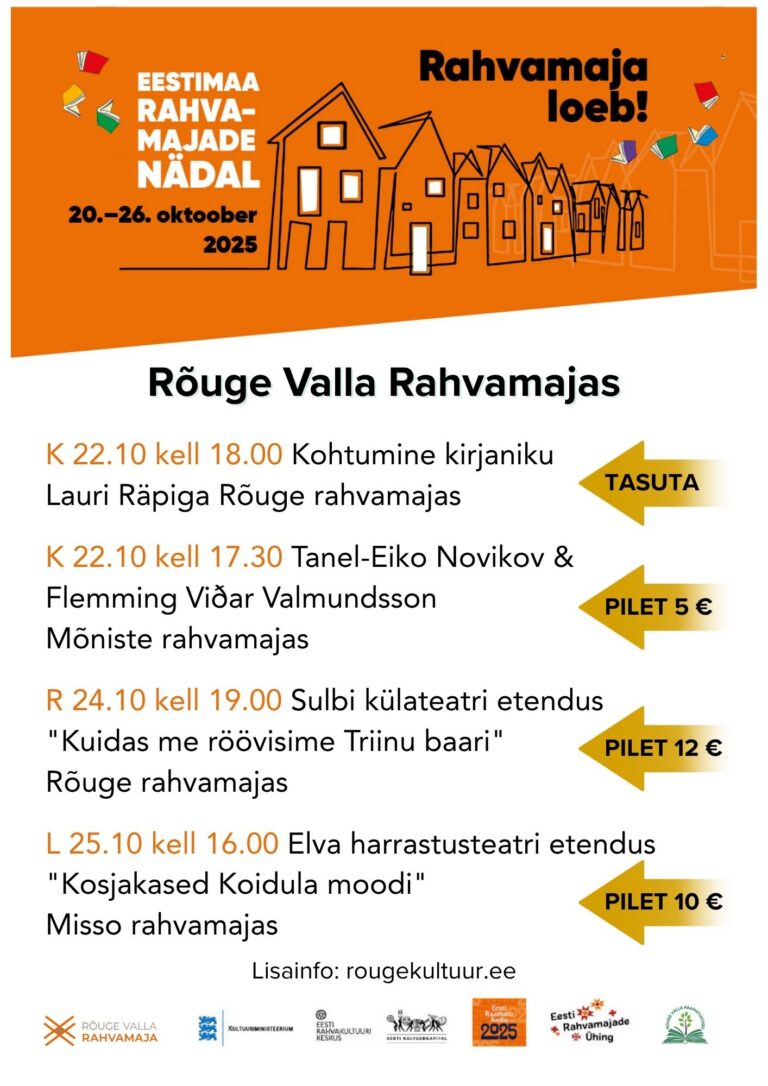 Avaldatud: 22 oktoober, 202520.–26. oktoobrini on käimas Eestimaa rahvamajade nädal. Sel puhul on Rõuge rahvamajas erinevad sündmused. Juba täna on kavas kaks sündmust.