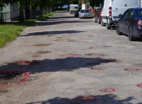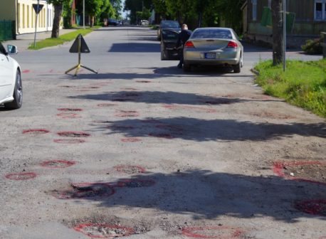 Võru Koidula tänava järvepoolse otsa elanikud märgistasid reede õhtul punasega oma kodutänava loendamatud teeaugud, lootusega, et linnakassast leitakse raha uue teekatte ehituseks.