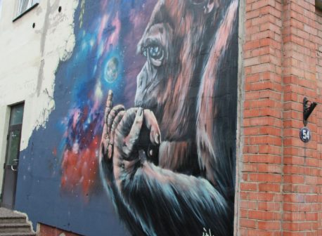 Tänavakunstnik Sänk tegi Võru keskraamatukogu hoone noortekeskuse-poolsele nurgale graffiti, kus ilutseb mõtlik gorilla ja suur kosmos.