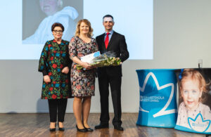 Pildil Sirje Karis koos nõukogu esimehe Gert Tiivase ja auhinna saaja SOS Lasteküla ennetustöö koordinaator Sirli Arroga. Foto: Priit Jõesaar