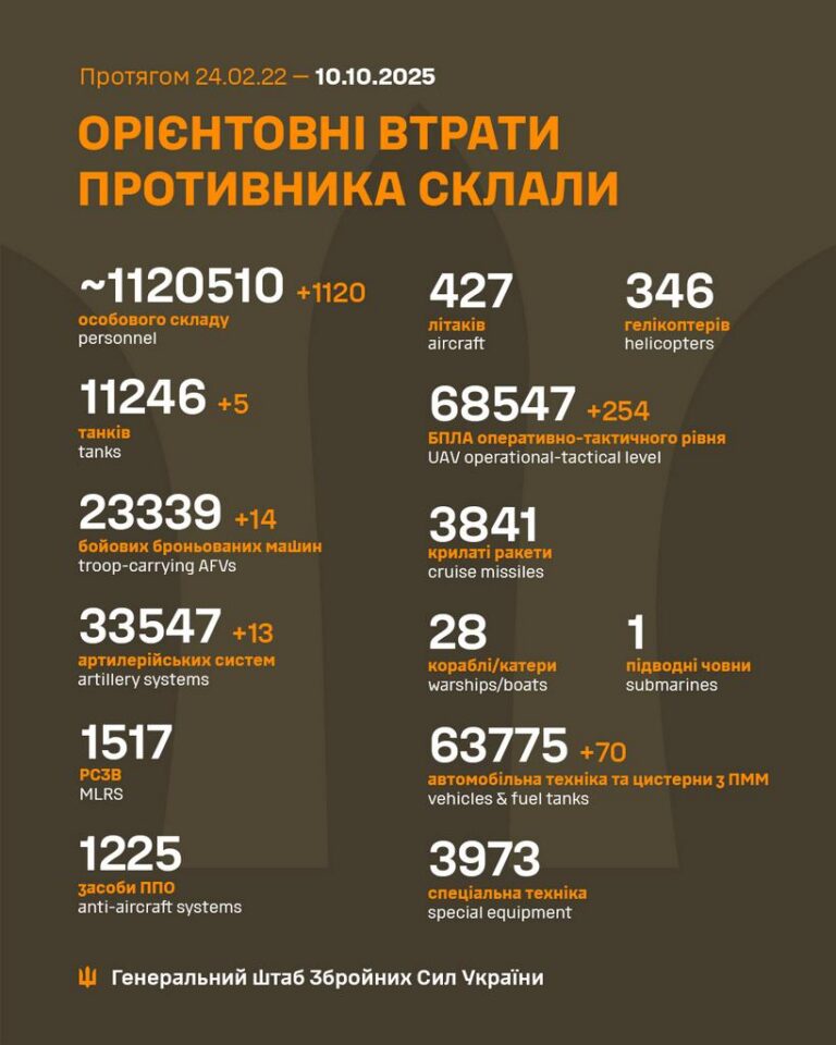 1. 10. oktoobri öösel ründas vene okupatsiooniarmee Kiievit ballistiliste rakettide ja ründedroonidega. Kiievis puhkes 17-korruselises hoones vaenlase droonirünnaku tagajärjel tulekahju. Inimesed evakueeriti ja on ka ohvreid. Ühel jõe poolel pole elektrit (pool linna) infrastruktuuri tabamuste tõttu.