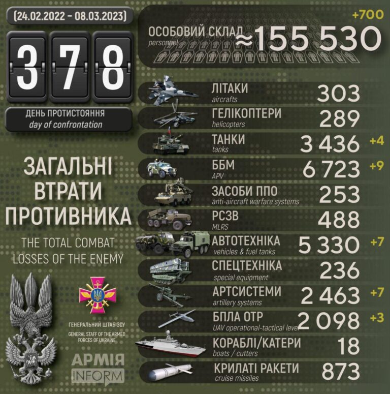Bahmut: kogu rindel põhiliselt jalaväega vene pool tihedat rünnakutelainet jätkas. Tundub, et otsitakse kõikjalt mingitki edenemise võimalust ja eks mõnes kohas mõnisada meetrit ka edasi saadakse. Põhja poole pole juba mitu nädalat suudetud liikuda. Siin on vene soldatite ja wagneri otsimine kõigilt possadelt nii hoos, et isegi üksikuid mehi Ukraina otsib ja sinna kas granaate pillab või töötleb kaudtulega. On vene poolgi juba aru saanud, et esimestel possadel enam suuremaid üksusi kaitses ei hoita. Küll kipuvad ikka veel rünnakud olema käpardlikud. Rühm liigub rünnakul põhiliselt kolonnis ning liialt tihedalt koos. Tagumised saaksid vaid omasid selga tulistada ja ollakse liialt lihtne sihtmärk nii Ukraina sõduri automaadile/kuulipildujale kui kaudtulele. Jah, pole eriti näinud söösta-kata liikumist või üldse head sünkroonis üksuse sisest liikumist. Bahmuti loodepoolne ümberpiiramise teravik eilegi edasi ei liikunud ning suure maanteeni jõutud seni pole. Lahingud jätkuvad ikka terve päeva ja seni suudetakse oma ülemuste poolt neid vene soldateid surma saata. Arvamused liiguvad, et vene poolel on kulunud Bahmuti senisele ründamisele u 30 000 soldatit. Bahmuti linnas siiski vene pool kvartali kaupa edeneb nii põhja, ida kui lõuna poolt. Hetkel tundub, et üks väike sillapea on veel jäänud Bahmutke jõe idakaldale. Ümberpiiramise edelepoolne suund ka seisab ja siin on Ukraina muutunud järjest aktiivsemaks ning oma vasturünnakute ja täpse ning tiheda kaudtulega ei anna vene poolele võimalust suuremaid rünnakuid käima saada. Maastik on pehme ja raskesti läbitav isegi maasturitele. Ukraina üritab leida rohkem võsa vahel ida-läänesuunalisi liikumisteid oma vägede varustamiseks ja seni kahjuks näeb isegi seal päris palju pihta saanud põhiliselt tsiviiltranspordivahendeid (arvatavalt enamasti sõdurite kasutuses olevaid). Kiputakse arvama, et Bahmuti vallutamine siiski vene poolele jätkuedu võimalust ei loo, sest polevat piisavalt soomusüksusi, rääkimata nende heast koordineeritud ühistegevusest üksuste vahel. Ka peaks olema seal mitmekordne Ukraina kaitserajatiste võrk ees ootamas.