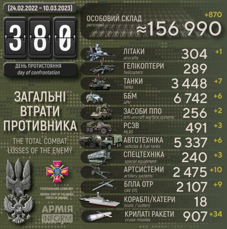 9. märtsi öösel ja varahommikul toimus Ukraina suuremate linnade pihta 2023. aasta suurim raketilöök. Teele läks Ukraina kriitilise infrastruktuuri poole 84 erinevat raketti, sealhulgas 28 Kh-101/Kh-555 ja 20 tiibraketti Kalibr, kuus laevatõrjeraketi Kh-22, kuus hüperhelirakettiga Kh-47 Kinzhal, kaks Kh- 31P ülehelikiirusega laevavastast raketti, kuus juhitavat raketti Kh-59 ja vähemalt 13 S-300 õhutõrjeraketti pluss kaheksa Iraani drooni Shahed-136, mis Ukraina ametnike sõnul püüdsid enne raketirünnakuid Ukraina õhutõrjesüsteemide tähelepanu kõrvale juhtida. Ukraina väed tulistasid väidetavalt alla 48-st Kalibr ja Kh-101/Kh-555 tiibrakettidest 34 ning neli drooni Shahed-136. Ukraina ametnikud märkisid ka, et kõik kaheksa Kh-31P ja Kh-59 raketti ei jõudnud sihtmärkideni. Ukraina õhujõudude pressiesindaja Juri Ihnat märkis, et Ukraina vägedel ei olnud suutlikkust osa Venemaa rakette alla tulistada – viidates tõenäoliselt rakettidele Kinzhal ja S-300. Õnneks siiski tabati nii suure rünnaku käigus liialt vähe Ukraina energiataristut ja mitmetes linnades kestis elektrikatkestus vaid mõne tunni ja seegi pigem eelneva väljalülitamise tõttu. vene milblogijad on vastakate arvamustega sellise rünnaku vajalikkusest ja liialt väiksesest kasust. Kuna see rindel muutusi ei too ja siiani Ukraina elektritaristut päriselt hävitada pole suudetud ning paljude nende rakettide asendamine on keeruline, siis kiputaksegi arvama, et tegu pigem kremli meediaoperatsiooniga siseriiklikule tarbijale.