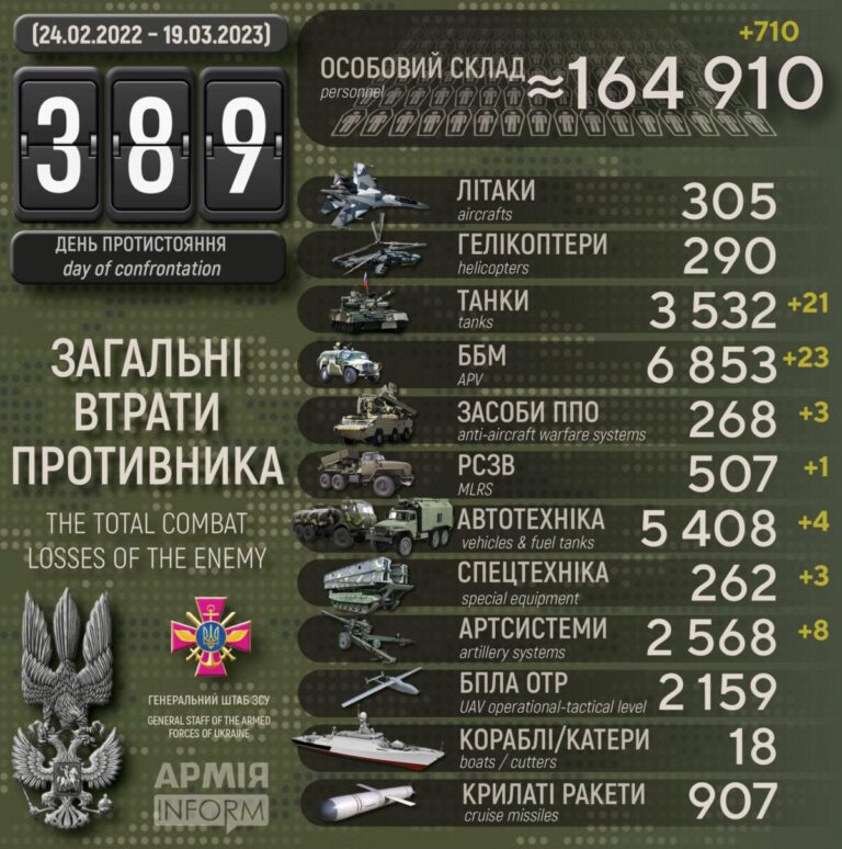 Lõunarinne/Herson: siingi kogu rindelõigul vene kaudtuletöötlus kasvas. Kas oli põhjuseks putini visiit Krimmi poolsaarele või miskit muud? Krimmi poolsaare vallutamise 9. aastapäeva tähistamisele putin tuli ning käis ka Mariupolis ning pidas nõu gerassimoviga Ukraina suunalise sõjategevuse peakorteris Rostovis. Eks gerassimov pidi tutvustama oma plaani, kuidas „vabastatakse” Luganski ja Donetski oblastid… Sõjatehnikat venemaa avarustest järjest juurde tuuakse. Küll said Ukraina omad kätte Hiina päritolu laskemoona vene possadelt ja oli nii käsitulirelvade kui miinipildujate moona.