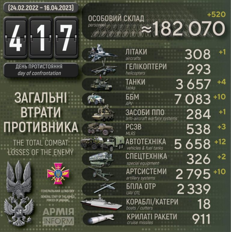 Lõunarinne/Herson: eile millegipärast vähenes vene kaudtulelöökide arv lõunarindel. Kas Melitopoli kandi töötlemine tõi tõrkeid kaudtulemoona logistikaahelasse või jätkuv mõne vene kaudtuleüksuse tabamine Ukraina poolt oma mõju annab. Hersoni kandis suht võrdne kaudtuleduell. Miskipärast Sevastoopolis (Krimmi poolsaar) lõpetati rahvale meretransport. Põhjus teadmata. Hetkel vaid kõlakas, et lõunarindel asuvatest linnadest ja küladest soovitatakse okupatsioonivõimudega koostööd teinud isikutel lahkuda Krimmi poolsaarele enne 20. aprilli.