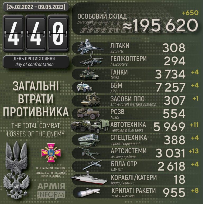 uus õhurünnakute laine Ukraina suunal, pingeline olukord jätkub Bahmuti, Avdiivka ja Marinka juures (rindejoone muutusi ei tuvastanudki), pisu segased infokillud lõunarindelt, vene paraadist (pisu kreml siiski kardab Ukrainas hukkunute mälestamisega seonduvalt rahutuste algust), vene kohalikeeelarvete raskustest ja uus USA abipakett jne.