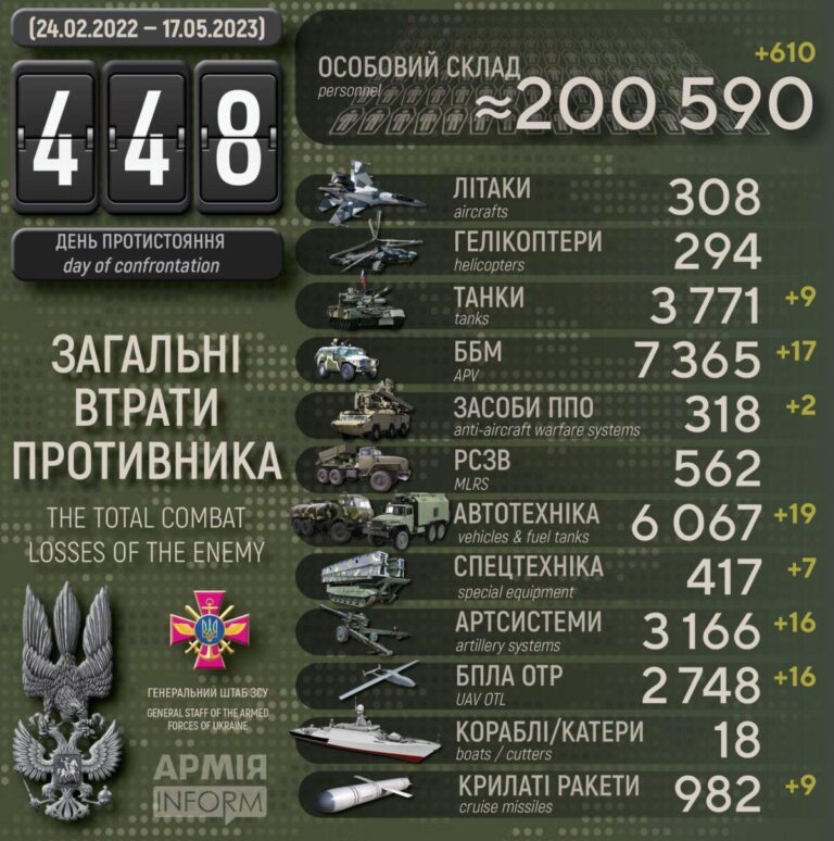 lahingute arv on hakanud tasapisi tõusma, rindejoones mõned väikesed muutused, Kupiansk-Kreminna rindel kolmes lõigus vene poole rünnakud jätkuvad, vene pool jätkab tõsiseid pingutusi Bahmuti vallutamiseks ning vaikne pole ka Avdiivka ja Marinka juures, igapäevane Ukraina linnade pommitamine jätkub, kgb soovib rohkem õigusi toimetamaks nii venemaal kui okupeeritud aladel, pisu murest seoses peatse USA sõjalise abipaketi lubatud kogusumma täitumisega, Youtube hakkas wagnerit blokkima, Euroopa Nõukogu tippkohtumine ja Ukraina ühines Tallinnas asuva NATO küberkaitsekoostöö keskusega…