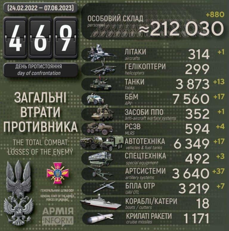 1. Eile vene poolel rakette ega droone Ukraina suuremate linnade pommitamiseks ei jagunud. Vaid Harkiv elab S-300 rünnakute all. Mujal pommitati vaid kaudtuleulatuses olevaid rindelähedasi linnasid/külasid ja piiriäärseid Ukraina külasid. Nagu ikka, siis iga Ukraina hoone on sõjaline sihtmärk. Kasvab Nova Kakhovka tammi vene poolse õhkimise tagajärjel üleujutus Dnepri mõlemal kaldal. Ukraina on evakueerinud juba 17 000 inimest ja üle 80 asula on vee all ning seni üleujutuse kasv jätkub. Ukraina andmetel on üleujutuse tõttu sattunud vette sadu tuhandeid tonne õlisid, kütust ja muud keemiat. Ukraina omad tõid eile välja kogu selle vene üksuse nimekirja, kes peaksid osalised olema tammi õhkimises. Küll tundub, et vene poolel ikka koordineerimisega muresid ning olla mitmeidki nende üksusi jäänud üleujutuse küüsi rääkimata vees vedelevast sõjatehnikast. Küll ei jäetud pommitamast Hersoni linna selle evakueerimise ajal. Hetkel vene pool kiitleb, et Krimmi veereservuaarid vett täis ja seda jätkuvat 2 aastaks. Kohalikele peaks vett jaguma ka ilma Krimmi veekanalita, aga põllumeestel kastmiseks vett ei piisa. Enerhodaris asuva tuumajaama jahutuseks oleva vee hulk olevat hetkel piisav, aga vähemalt ise pole kindel, et see pikamas ajas piisavaks jääb. Lisaks pole kindel, et vene pool sellega Ukraina suurema rünnaku siit suunalt elimineeris. Kui vesi alla langeb, siis pigem võimalused kasvavad.