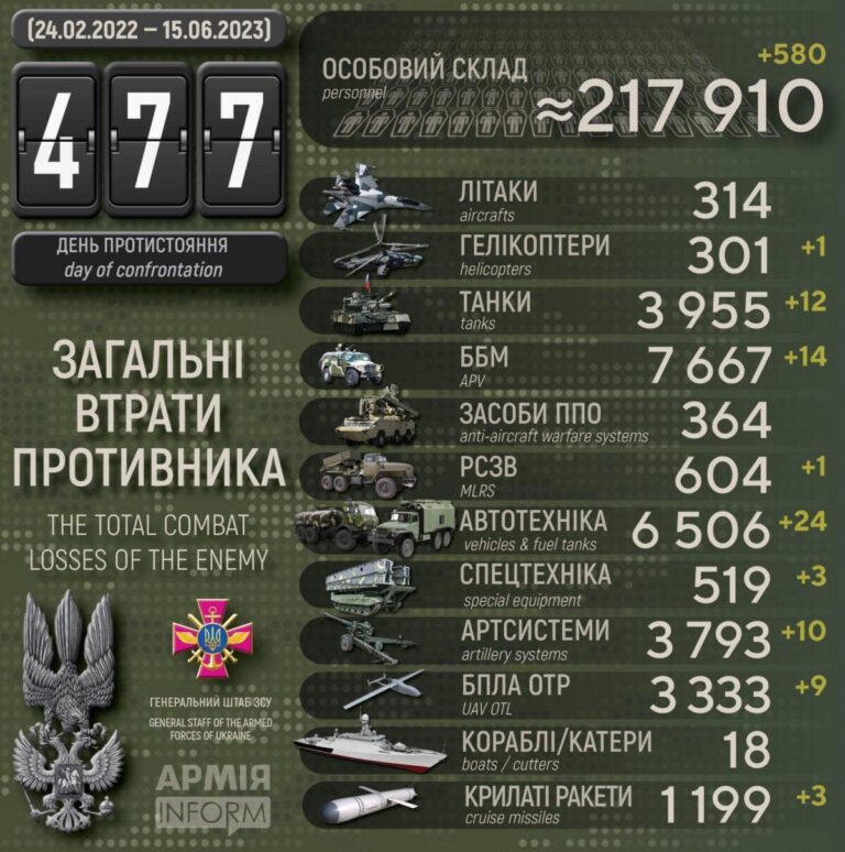 8. Herson: veetase jätkab langemist ning vene poole arvates peaks u 20. juuniks veeseis jõudma oma uude tavapärasesse madalseisu. Küll arvab vene pool, et vaatamata esimese kaitseliini rikutusele Dnepri idakaldal siiski Ukraina siit suuremat pealetungi ei plaani ning olla lausa hakanud siit vägesid lõunarindele suunama. Ise veel seda rünnakusuunda maha ei kannaks, sest nüüd (peale 20-ndat) peaks hoopis olema Dnepri ületamine lihtsam.