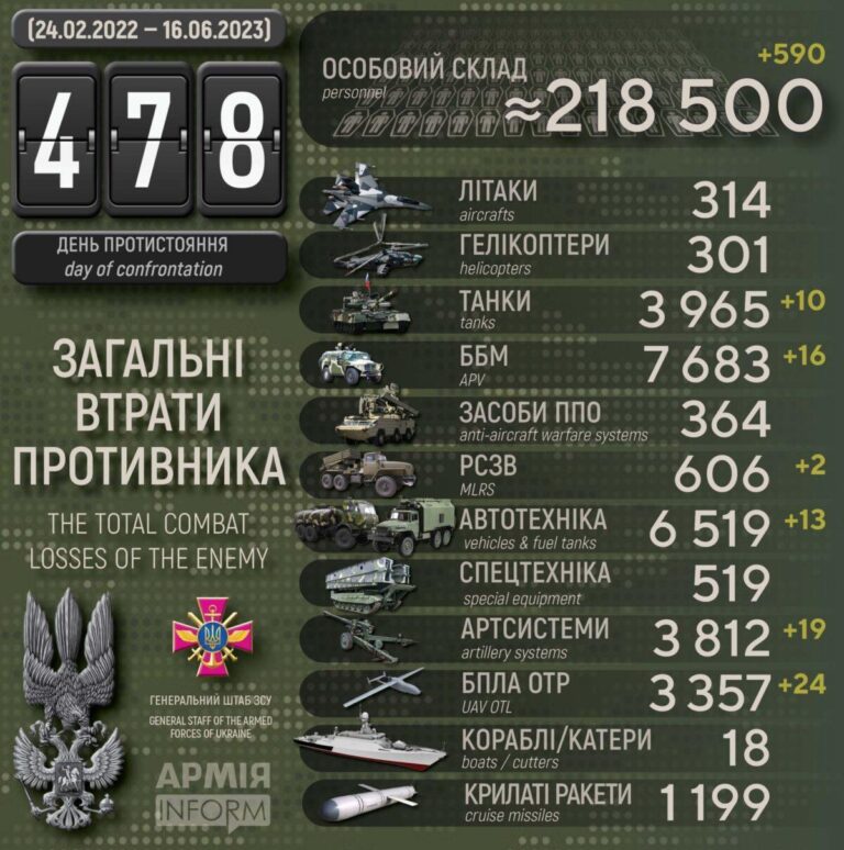 1. vene väed korraldasid 15. juuni varahommikul järjekordse drooni- ja rakettlöökide seeria üle Ukraina. Ukraina kindralstaap teatas, et 15. juunil kella 00.20-04.30 kohaliku aja järgi lendasid neli Kh-101/555 tiibraketti ja 20 Iraani drooni. Ukraina sõjaväeallikad teatasid, et Ukraina õhutõrje tulistas alla ühe tiibrakettidest ja kõik 20 Iraani drooni. Ülejäänud kolm tiibraketti tabasid Dnipropetrovski oblasti tööstusrajatisi. Piiriäärsed Ukraina külad igapäevases pommisajus.