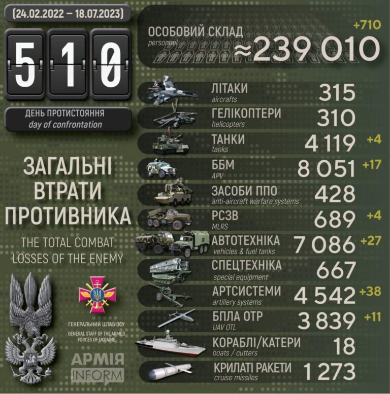 3. Kupiansk-Kreminna: ei jätkas vene pool surve tõstmisega ja suutis edeneda neljas lõigus. Masjutivkast lõuna pool (Kupianskist kirdes) suutis vene pool jõuda paari kilomeetrisel lõigul Oskili jõeni. Novoselivske küla (maanteel Svatove-Kupiansk) on nüüd vene kontrolli all. Eks see küla käib pidevalt käest kätte, sest kaudtule eest varjumiseks ühtki kohta alles pole seal jäänud. Veelgi raskem on olukord Kupianski-Kreminna vahel, kus Karmazõnivkast läänes toimunud raskete lahingute tulemusena sai vene pool 1kmx1km sillapea üle Zerebetsi jõe ning kontrollib sealset metsatükki. Sildu seal kandis läheduses pole ning rünnaku jätkamiseks peab vene pool tegema pontoonsilla, millele eriti ei panustaks. Kreminnast edelas asuvas metsaalas olla ka pisu vene pool edenenud. Ukraina kinnitusel: vene armee on koondanud Kupiansk-Kreminna suunale väga võimsa rühmituse – üle 100 000 isikkoosseisu, üle 900 tanki, üle 555 suurtükiväesüsteemi, 370 mitmekordse stardiraketisüsteemi (dessantüksused, parimad vene motoriseeritud jalaväeüksused, lisaks on reservväelasi BARSist, territoriaalväed, erasõjaväekompaniid, Storm- Z jne). Kuna see suur seltskond paiknes seal juba alates talvest, siis ei kipu uskuma, et suurem vene surve tuli Ukrainale üllatusena. Vägisi hakkab tekkima tunne, et Ukraina võib üllatada uue rünnakusuunaga pisu rahulikumas rindelõigus või on valmistanud Kupiansk-Kreminna lõigus ette „tapaalad”, et siis nende rakendumisel asuda ise kiirele suuremale vasturünnakule, kasutades ära vastase segadust ning taandumist.