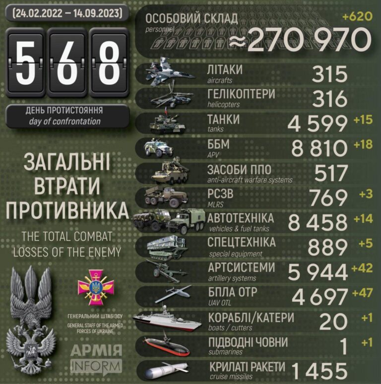 2. Ukraina sõjavägi teatas edukast löögist vene KS-701 Tuna tüüpi paadile. See juhtus Musta mere loodeosas. Lisandus täpsem info: 13. septembril Sevastoopolis asuvale Ordžonikidze laevatehasele suunatud rünnaku tagajärjel tabati suurt dessantlaeva Minsk ja allveelaeva Doni-äärne Rostov (mida Kiievi teatel kasutati rakettidega Kalibr Ukraina territooriumi ründamiseks). Oryxi analüüsikeskuse eksperdid märgivad, et esimesed fotod sündmuskohalt näitavad Minski täielikku hävimist, mitte kahjustusi. Tehase pihta tulistati kokku 10 Storm Shadow raketti, neist kolm jõudsid sihtmärgini. Venemaa poolt ametisse nimetatud kuberner Mihhail Razvožajevi sõnul sai rünnakus vigastada üle 20 inimese. Laevad olid seal kuivdokis ja nüüdseks peaks olema vene sõjalaevastiku edasise remondiga päris pikalt keeruline. Lisaks Venemaa kaitseministeerium väidab, et hävitas Mustal merel kolm Ukraina meredrooni, võimalik, sest päeval oli jälle Kertši sild suletud.