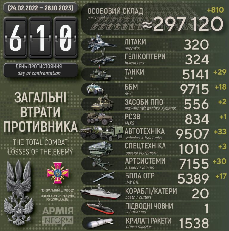 Ukraina reservohvitser avaldas 23. oktoobril satelliidipildid ja kinnitas, et vene sõjaväelased kaotasid 10.–20. oktoobril Avdiivka lähedal üle 109 sõjaväemasina. Reservohvitser nentis, et suurema osa Venemaa kaotustest moodustasid peamiselt soomukid, nagu BMP-1 ja BMP-2 ning MT-LBd; tankid T-72, T-64 ja T-80; BTR soomustransportöörid ning muud transpordivahendid. Reservohvitser väitis, et vene sõidukite kaotused Avdiivka ümbruses on ületanud Venemaa sõidukite kaotusi Siversky Donetsi ülesõidul 2022. aasta mais ja tõenäoliselt ületavad Venemaa sõidukite kaotused kaotusi Vuhledari piirkonnas ajavahemikus 2022. aasta novembrist kuni 2023. aasta aprillini. Reservohvitser väitis, et vene väed võivad on kaotanud veel kümmekond sõidukit, mis jäid ebakindlate kujutiste tõttu lõplikust loendusest välja ning märkis, et kahe täpsustamata sõltumatu allika hinnangul on vene väed Avdiivka lähedal kaotanud umbes 200 sõjaväesõidukit.