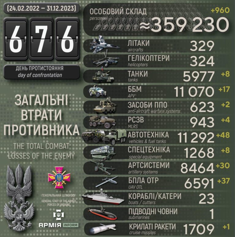 1. Eilse Ukraina droonilöögi tulemustest: 30. detsembri öösel tehti kombineeritud rünnak sõjaliste sihtmärkide pihta Venemaa eri piirkondades. Märgitakse, et Venemaa sõjatööstuskompleks on saanud „märkimisväärset kahju”. Sihtmärkideks oli Brjanskis asuv Silicon El tehas, kus toodeti lahingraketisüsteemide elektroonikakomponente, samuti rünnati NSV Liidu 50. aastapäeva järgi nime saanud Brjanski keemiatehast. Lisaks sattusid rünnaku alla sõjalise infrastruktuuri objektid Belgorodis, Tuulas, Tveris ja Moskvas. Hoolimata asjaolust, et osa droonidest tulistas alla Venemaa õhutõrje, jõudis „märkimisväärne” osa sihtmärkideni. Osa surnukehasid pole veel suudetud rusude alt kätte saada, sestap ka surmasaanute arv tõuseb.