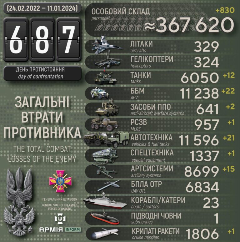 Nagu ArmiyaInform teatas, toimus 9. jaanuaril 2024, kuuesaja kaheksakümne viiendal päeval Vene Föderatsiooni ulatusliku relvastatud agressiooni ajal Ukraina vastu rindel 64 lahingukokkupõrget.