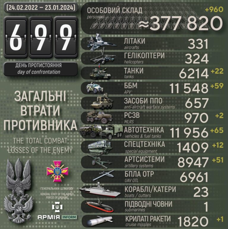 8. Herson: tugev surve põhiliselt Krõnki suunal jätkus. vene poole blogijad andsid teada, et Ukraina kaotused on kõrged (1.-20. jaanuar 350 merejalaväelast). Isegi, kui suurusjärk on ligilähedane, siis vene poole kaotused olid tuhandetes, rääkimata tehnikast. Seda, et siin rindel raske on, tunnistab ka Ukraina. Veod üle Dnepri pole lihtsate killast ning egas vene liugpommide tabamuse eest pole Krõnki ümbruses ka erilist kaitset ning kui pole hoonete keldreid, siis ka sügavusse kaevumine on keeruline, sest kohe tuleb vesi vastu. Õnneks on siin suunal suudetud olla domineeriv droonide ja kaudtulega.