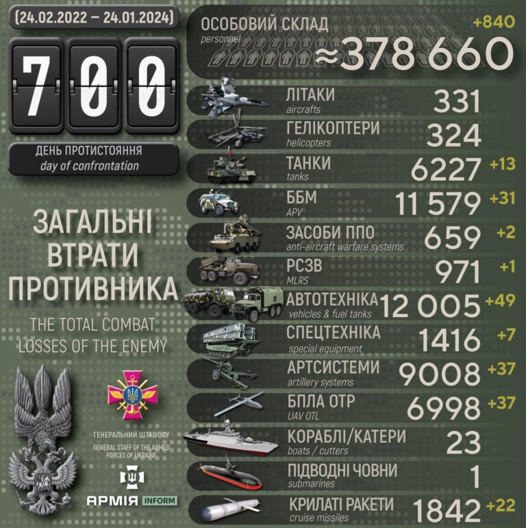 23. jaanuari päeva jooksul toimus 56 korda lahingutegevust. Vaenlane sooritas kokku 48x raketi- ja 112x õhulööki, 73x MLRS-rünnakut Ukraina vägede ja erinevate asulate positsioonidele. Kahjuks on Venemaa terrorirünnakutes hukkunud ja haavatud tsiviilisikuid, sealhulgas lapsi. Kiievis ja Kiievi oblastis, Harkivis ja Pavlohradis (Dnipropetrovski oblastis) hävis või sai kahjustada enam kui 200 korda mitut tsiviilinfrastruktuuri.