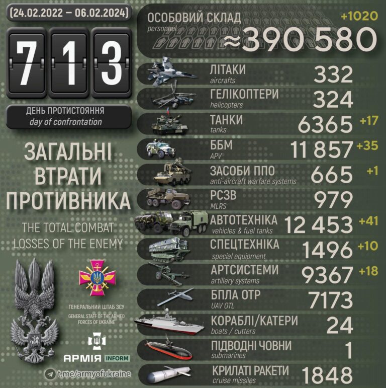 6. Donetsk: Olukord Avdiivkas on ülimalt keeruline, vene pool on kindlalt jalad maha saanud linna põhja- ja lõunaservas. Raskemad lahingud kestavad terve öö. Eile suutis vene pool põhjalõigul veelgi edeneda ning järjest kotisuu koomale läheb. Lõunalõigus vene poole edenemisi ei tuvastanud. Njah, vene rünnakute arv vaid tõuseb, ainult Avdiivka-Pervomaiske kandis u 45 rünnakut. Õnneks mujal vene poole edenemisi ei tuvastanud. Jätkuvalt suudab küll Ukraina vähendada lähenemisteedel vene rünnakukolonne, aga mitte piisavalt ja madal pilvisus mõjub seire kvaliteedile ning vene pool on õppinud seda ära kasutama.