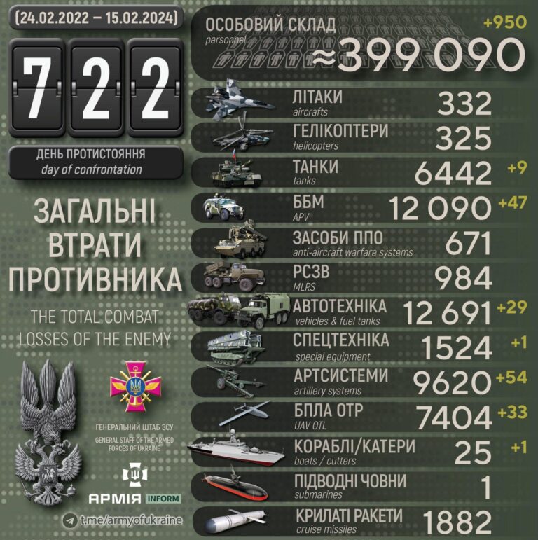 6. Donetsk: Avdiivka kaitsmine jätkub, aga kuratlikult raske on. Ei kujuta ette, kuidas siin üldse suudetakse tuvastada vene poole rünnakute arvu. Olukord halveneb jätkuvalt õhutõrjerelvade ja rakettide lakkamatu tulistamise tõttu. Kõik suunad, kus viimastel päevadel on suutnud vene pool edeneda, järjest jao ja rühma suuruseid jalaväeüksuseid nagu konveieril edasi saadetakse. Kipuvad jätkuvalt linna poolitavas harus üritama järjest enam linna laiali valguda. Eile küll rindejoone muutusi selles harus ei tuvastanud, aga Ukraina blogijate hinnagul siiski hooneid järjest kaotatakse. Küll on ilmunud uued videod, kus kergemate lääne soomukitega üritab Ukraina pimedas tänu paremale termovaatlusvõimekusele olukorda parandada. Pisu on olukorra keerukuse tõttu hädas vene kaudtule ja lennunduse üksused, sest omatuli on lihtne tulema.