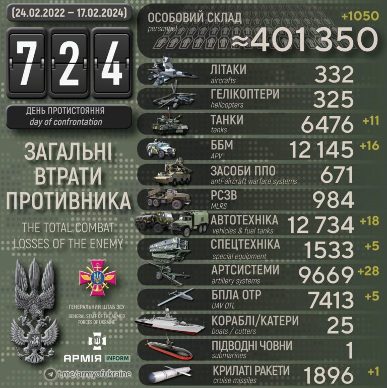 Pärast Avdiivkasse ümberpaigutamist on 3. üksik rünnakubrigaad hävitanud 4000 vene sissetungijat. Linnas on positsioone, mida hoiavad kuus Ukraina võitlejat ja neid ründab umbes 100 sissetungijat. Sellest teatas 3. eribrigaadi ülema asetäitja Maksim Žorin (originaalsõnum sisaldab roppu keelekasutust). „P***** [okuandid] ei võta oma kaotusi arvesse. Ka meie ei võta nende kaotusi arvesse,” kirjutas ta. Žorini sõnul on tõesti raske täpselt välja arvutada, kui palju venelasi Avdiivkas hukkub: eile ühe rünnakuga ühele positsioonile likvideerisid Ukraina kaitsjad ligikaudu 80 sissetungijat. „Ma arvan, et neil pole kunagi olnud selliseid kaotusi kui Avdiivka lahingutes.”