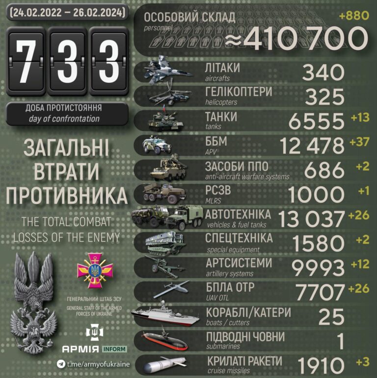 Samuti andis Ukraina president hinnangu vene poole kaotustele, öeldes, et kahe sõja-aasta jooksul hukkus 180 000 vene sõjaväelast ning haavatuid arvestades on koguarv kuni 500 000 inimest.