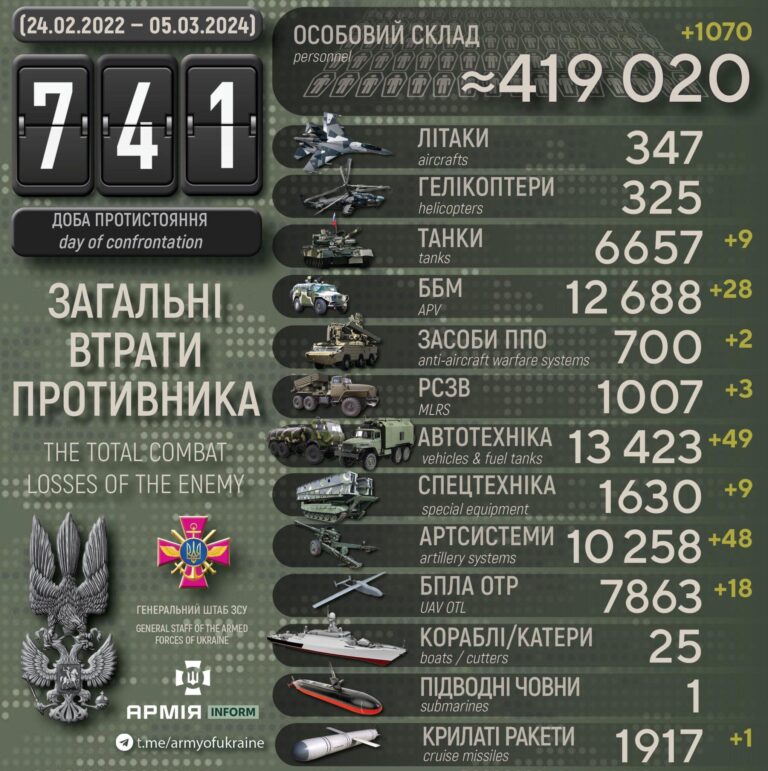 Pärast sissetungi Ukrainasse on Venemaa kaotanudenam kui 355 tuhat sõjaväelast hukkunute ja haavatutena, prognoosib Briti kaitseluureagentuur. Ta hindab, et tänavu veebruaris saavutasid päevanumbrid kõrgeima taseme pärast sõja algust. Seega kaotas vene armee päevas keskmiselt 983 hukkunut ja haavatut.