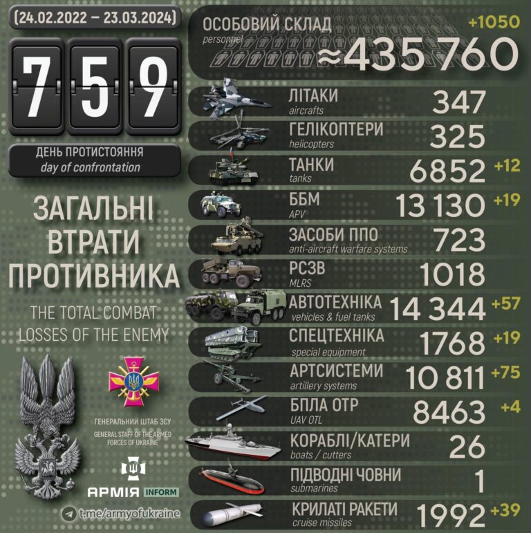 terrorirünnak Moskvas varjutas Ukraina sõja uudised ning viimase ööpäeva vene poole 69 maapealset rünnakut, kokku 88 raketti ja 143 drooni, 92 MLRS-rünnakut Ukraina vägede positsioonidele ja erinevatele asundustele ning kokku 140 Ukraina asulat pommisajus polekski nagu võrreldav, njah… muutusi rindejoones siiski ei tuvastanud va Avdiivka lääneküljel hallil alal.
