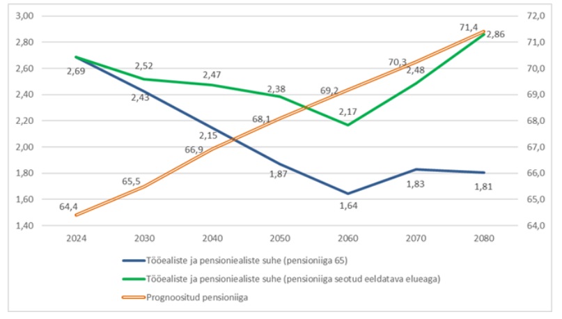 Märkus: 2024. aastal tööealised 20–63, pensioniealised 64+ ja muudetud vastavalt pensioniea tõusule, st 2080. aastal tööealised 20–70, pensioniealised 71+