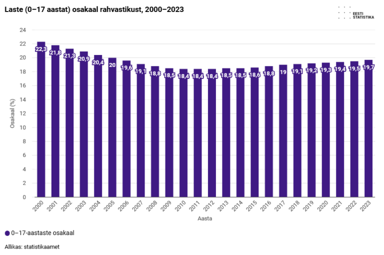 - 2023. aasta 1. jaanuari seisuga elas Eestis 269 111 last vanuses 0–17 eluaastat, kes moodustasid 19,7% kogu rahvastikust. Tegemist on suurima laste arvu ja osakaaluga alates 2005. aastast. Toona oli selles vanuses elanikke 271 760 ehk 20% rahvastikust.