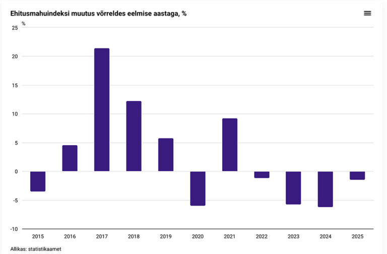 Avaldatud: 20 veebruar, 2026Statistikaameti esialgsetel andmetel ehitasid Eesti ehitusettevõtted 2025. aastal Eestis ja välisriikides kokku 1,5% vähem kui aasta varem. Ehitusmaht vähenes neljandat aastat järjest.