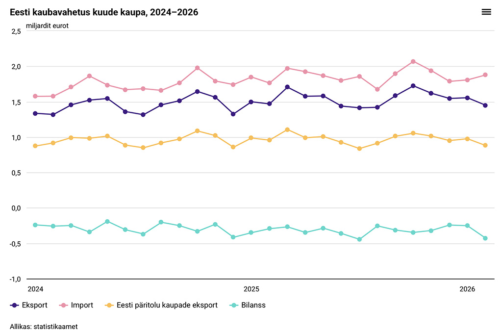 Avaldatud: 9 aprill, 2026Statistikaameti andmetel vähenes kaupade eksport tänavu veebruaris eelmise aasta sama kuuga võrreldes 1%, import aga suurenes 6%. Jooksevhindades eksporditi kaupu ligi 1,5 miljardi ja imporditi ligi 1,9 miljardi euro eest. Eesti päritolu kaupu eksporditi veebruaris vähem kui aasta varem.