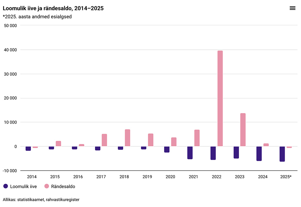 Statistikaameti rahvastiku- ja haridusstatistika teenusejuhi Kadri Rootalu sõnul süvenesid 2025. aastal viimaste aastate rahvastikutrendid. „Eelmisel aastal suri üle 6000 inimese rohkem kui sündis. Väljarändajate arv püsis mullusega samal tasemel, kuid sisserändajate arv vähenes. Rändesaldo jäi esimest korda alates 2014. aastast negatiivseks. Kokku langes Eesti rahvaarv 7041 inimese võrra,” kirjeldas ta.