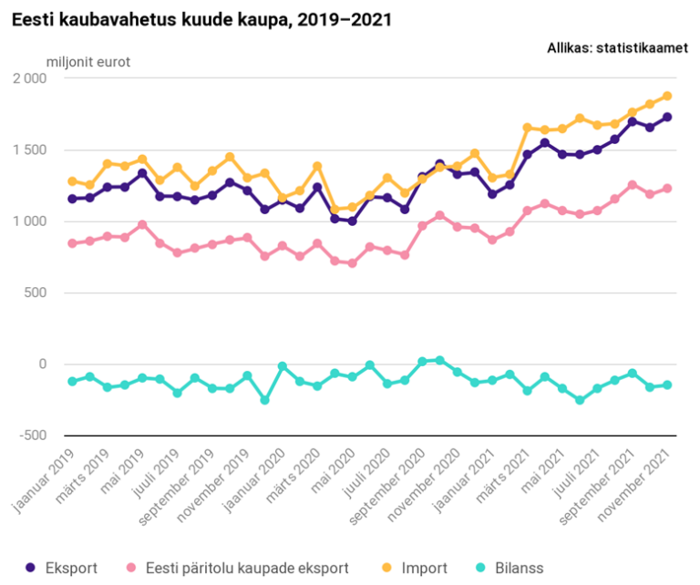 Avaldatud: 10 jaanuar, 2022Statistikaameti andmetel jätkus 2021. aasta novembris Eesti kaubavahetuse kiire kasv. Kaupade eksport suurenes võrreldes 2020. aasta novembriga 30 protsenti ning import 36 protsenti. Kaubavahetus kasvas enim Euroopa Liidu liikmesriikidega ja eelkõige naaberriikidega.