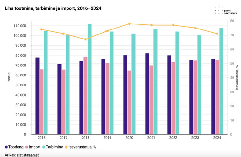 Avaldatud: 14 aprill, 2025Statistikaameti andmetel toodeti 2024. aastal Eestis 76 500 tonni liha, mis on 1% rohkem kui aasta varem. Keskmiselt toodeti aastas 56 kg liha inimese kohta. Koos imporditud lihaga söödi aasta jooksul kokku 78 kg liha inimese kohta. Elanike tarbitud lihast toodeti 2024. aastal Eestis 71%.