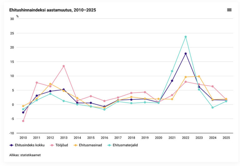 2025. aasta neljandas kvartalis tõusis ehitushinnaindeks kolmanda kvartaliga võrreldes 0,4% ja 2024. aasta neljanda kvartaliga võrreldes 1,6%. „Võrreldes kolmanda kvartaliga oli suurim mõju indeksile taas tõusma hakanud ehitusmaterjalide hindadel, mis kallinesid kvartaliga 0,6%. 2024. aasta neljanda kvartaliga võrreldes panustas indeksi tõusu samuti enim materjalide 2% hinnatõus,” lausus Paulus.
