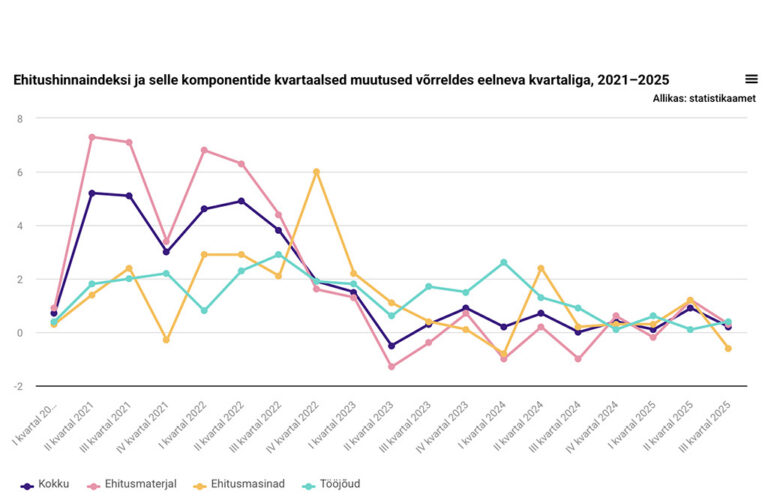 Avaldatud: 21 oktoober, 2025Statistikaameti andmetel tõusis ehitushinnaindeks, mis väljendab ehitustegevuse maksumuse muutust, kolmandas kvartalis võrreldes teise kvartaliga 0,2% ja võrreldes 2024. aasta sama ajaga 1,7%. Aasta võrdluses mõjutasid ehitushinnaindeksi tõusu enim kerkima hakanud ehitusmaterjalide hinnad.