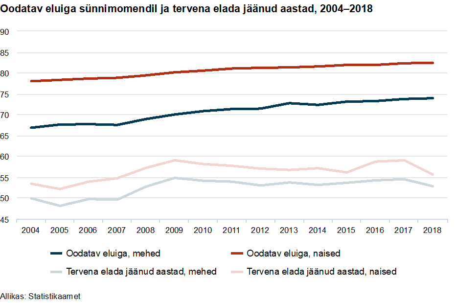 Avaldatud: 4 september, 2019Statistikaameti andmetel oli 2018. aastal meeste oodatav eluiga sünnimomendil 73,9 ja naistel 82,4 aastat. Mõlema soo esindajate eluiga on pikenenud, meestel veidi rohkem. Tervena elavad mehed 52,8 ja naised 55,6 eluaastat. Veel aasta tagasi näitas arvutus meestele ligi kaks ja naistele üle kolme aasta pikemat eluiga tervena.