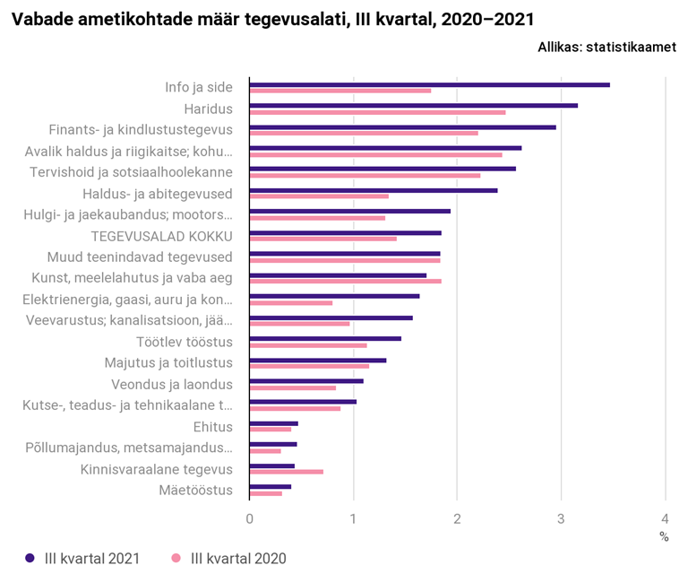 Statistikaameti analüütiku Argo Tarkiaineni sõnul olid 39% kõikidest vabadest ametikohtadest avalikus sektoris. „Vabade ametikohtade määr ehk vakantside osatähtsus ametikohtade koguarvus oli kõrgeim info ja side ning hariduse tegevusaladel, madalaim aga mäetööstuses ja kinnisvara valdkonnas,“ ütles ta.