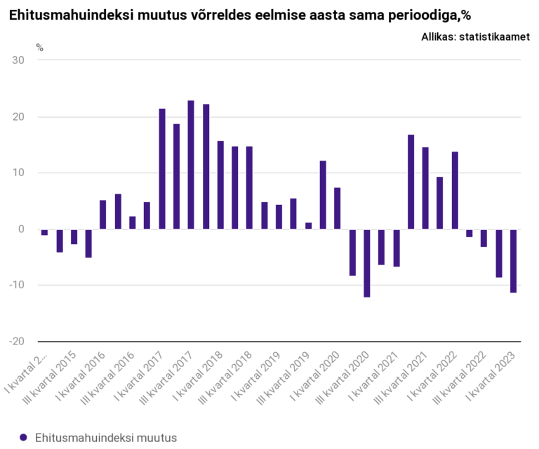 Avaldatud: 26 mai, 2023Statistikaameti andmetel ehitasid Eesti ehitusettevõtted esimeses kvartalis siin ja välisriikides püsivhindades kokku 11 protsenti vähem kui aasta varem samal perioodil.