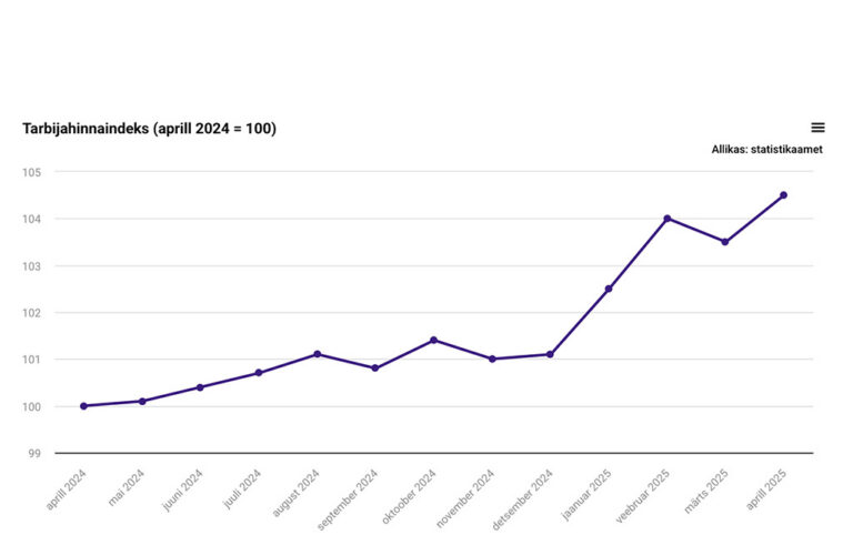 Avaldatud: 8 mai, 2025Statistikaameti andmetel tõusis tarbijahinnaindeks aprillis võrreldes märtsiga 1% ning 2024. aasta aprilliga võrreldes 4,5%. Eelmise aasta aprilliga võrreldes olid kaubad 2% ja teenused 8,6% kallimad.