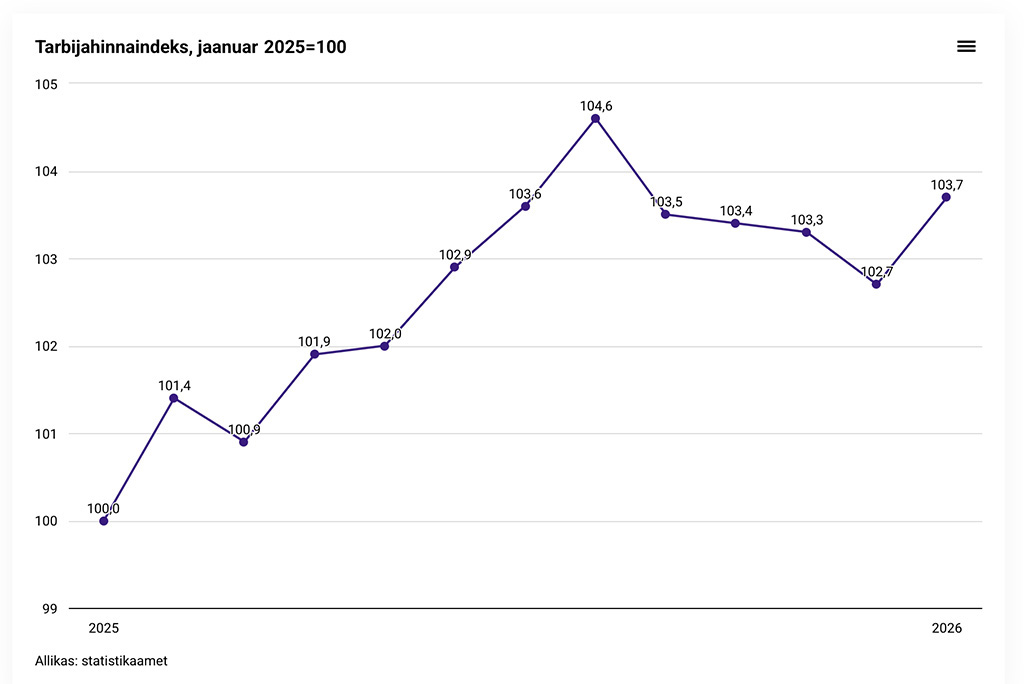 Avaldatud: 16 veebruar, 2026Statistikaameti andmetel tõusis tarbijahinnaindeks 2026. aasta jaanuaris eelmise kuuga võrreldes 1% ning 2025. aasta jaanuariga võrreldes 3,7%. Toidukaupade hinnad tõusid jaanuaris võrreldes detsembriga 2,3%.