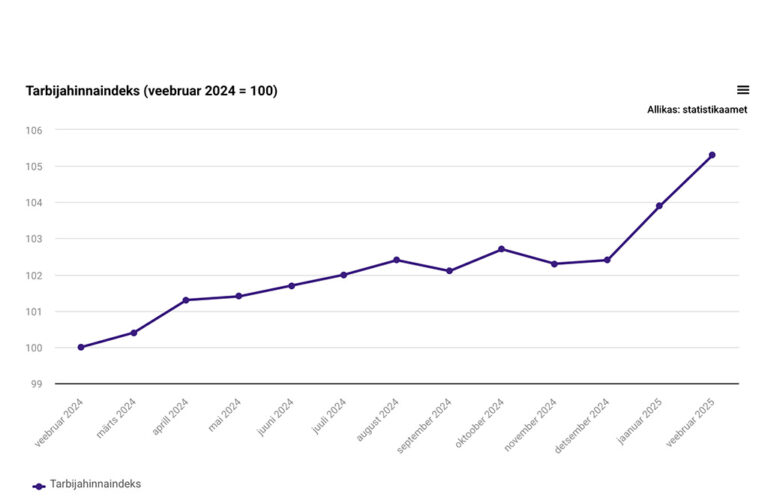 Avaldatud: 7 märts, 2025Statistikaameti andmetel tõusis tarbijahinnaindeks 2025. aasta veebruaris eelmise kuuga võrreldes 1,4% ning 2024. aasta veebruariga võrreldes 5,3%. Eelmise aasta veebruariga võrreldes olid kaubad 2% ja teenused 10,6% kallimad.