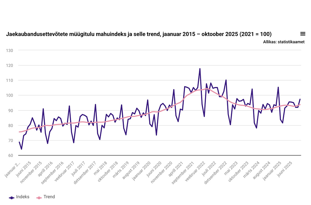 Avaldatud: 28 november, 2025Statistikaameti andmetel oli jaekaubandusettevõtete müügitulu 2025. aasta oktoobris 941 miljonit eurot. Võrreldes eelmise aasta sama ajaga kasvas müügimaht 4%.