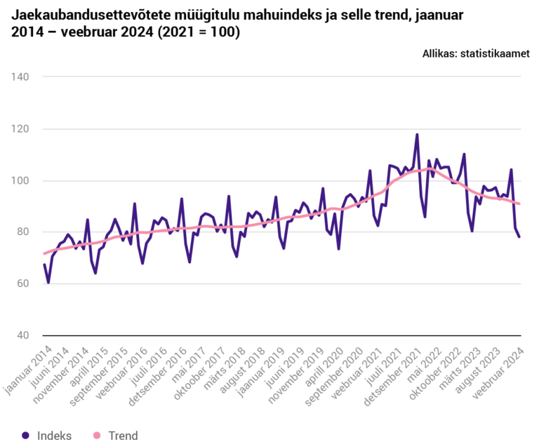 Statistikaameti analüütiku Johanna Linda Pihlaku sõnul on jaekaubandusettevõtete müügitulu vähenemine kestnud juba poolteist aastat järjest. „Eelmise veebruariga võrreldes kahanes tööstuskaupade kaupluste müügitulu 8% ja toidukaupade kaupluste müügitulu 2%. Mootorikütuse jaemüügiga tegelevate ettevõtete müügitulu kasv aga jätkus ning müük suurenes eelmise aasta veebruariga võrreldes 9%,” lisas Pihlak.