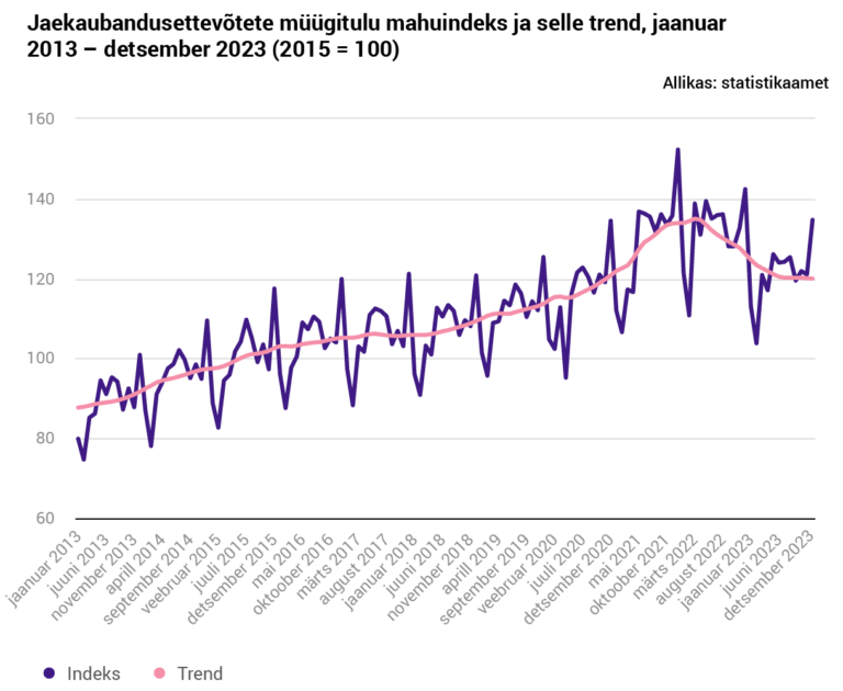 Avaldatud: 30 jaanuar, 2024Statistikaameti esialgsetel andmetel oli jaekaubanduse ettevõtete müügitulu 2023. aastal kokku 10,5 miljardit eurot. Võrreldes 2022. aastaga vähenes müügitulu püsivhindades 8 protsenti.