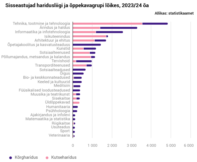 Statistikaameti rahvastiku- ja haridusstatistika tiimijuhi Terje Trasbergi sõnul võeti kõrghariduses 2023/2024 õppeaastal vastu inimesi 530-le ja kutsehariduses 584-le õppekavale. Need omakorda jaotusid 28-sse erinevasse õppekavagruppi.