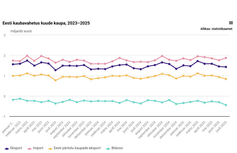 Avaldatud: 9 september, 2025Statistikaameti andmetel kasvas kaupade eksport 2025. aasta juulis võrreldes eelmise aasta sama ajaga 9 protsenti ja import 11 protsenti. Jooksevhindades eksporditi kaupu enam kui 1,4 miljardi ja imporditi ligi 1,9 miljardi euro eest. Kaubavahetuse puudujääk oli 444 miljonit eurot, mis on 76 miljonit eurot suurem kui aasta varem.