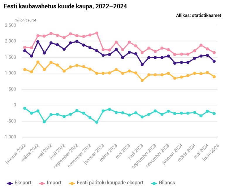 Statistikaameti andmetel vähenes 2024. aasta juunis eelneva aasta sama ajaga võrreldes kaupade eksport 14 protsenti ja import 11 protsenti. Kaupu eksporditi jooksevhindades ligi 1,4 miljardi euro ja imporditi üle 1,6 miljardi euro väärtuses. Kaubavahetuse puudujääk oli 268 miljonit eurot, mis on 20 miljoni võrra suurem kui aasta varem.