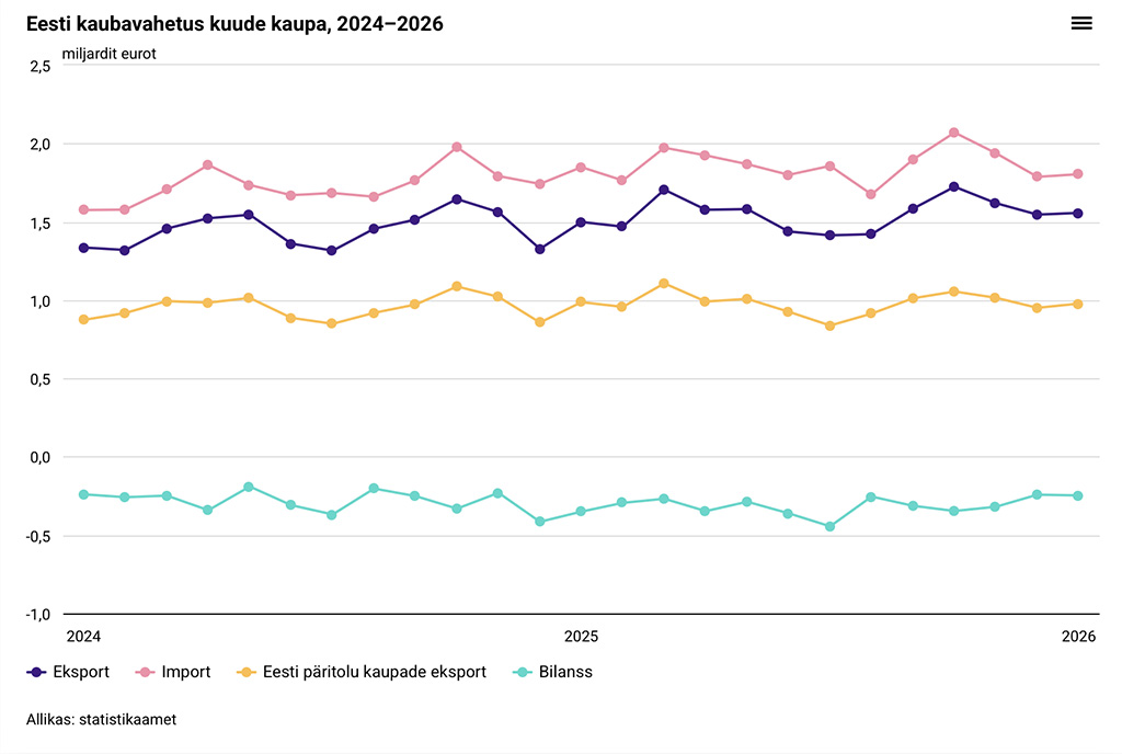 Avaldatud: 12 märts, 2026Statistikaameti andmetel suurenes kaupade eksport jaanuaris võrreldes 2025. aasta sama kuuga 4 protsenti ja import vähenes 2 protsenti.