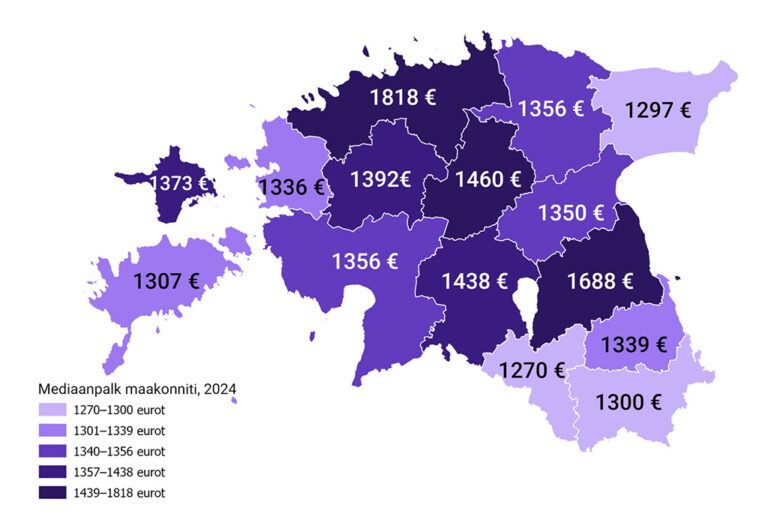 Kõrgeim keskmine palk 2024. aasta neljandas kvartalis oli Tallinnas – 2407 eurot. „Nii Harju kui ka Tartu maakonnas oli keskmine palk Eesti keskmisest kõrgem, vastavalt 2299 ja 2092 eurot,“ selgitas Saagpakk ja lisas, et kõige madalam palgatase viimases kvartalis oli Valga maakonnas (1507 eurot). Alla 1600 euro jäi keskmine palk ka Saare (1584 eurot) ja Lääne (1586 eurot) maakonnas.